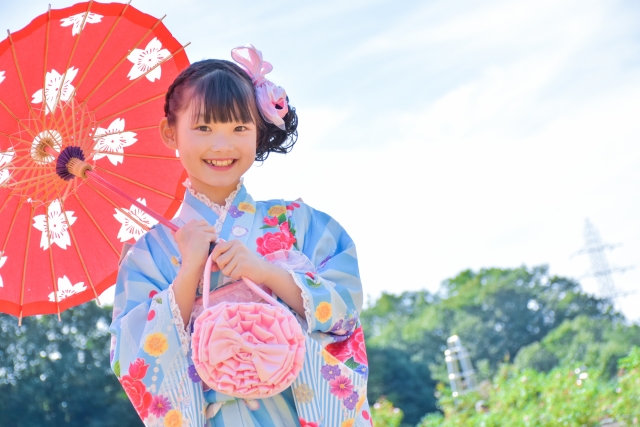 淡い水色の着物にちりばめられた赤やピンクの花柄が、春らしい華やかさと元気な印象を与えています。